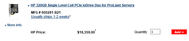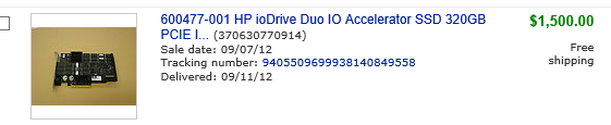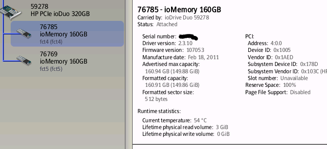 Follow-up from last post on 2.0 GBPS backup throughput – was able to update the firmware painlessly for the non-functional card from a Win 7 X64 machine so that it can now be updated on the HP Server to the latest HP-branded IO Accelerator driver. To my pleasant surprise, the last generic driver version (2.3.10) supported firmware updates all the way back from 2.1.0, the version associated with the firmware on the Card. As expected, the IO Accelerator card was virtually unused. It shows 0 GB Physical write. This 320GB HP IO Accelerator SLC Duo card was obtained for 1,500.00 from a liquidator on EBAY in September, the least I have ever paid for one of these. The price for a brand new HP SLC Duo on HP site? $18,359.00 so this was a savings of $16,859.00 – I essentially obtained a brand new card for around 8% of the retail price. Don’t get me wrong, I think this card is worth every bit of the HP $18,359.00 list price. However, the demand for second-hard cards of this caliber is very low so liquidators are pricing them ridiculously low compared to what they are really worth. I am the happy beneficiary.