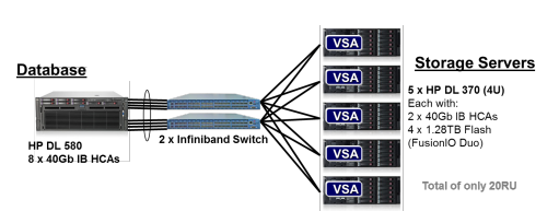 VSA based appliances are being used to enhance the performance of clustered databases by providing a “Fan-In” approach. High-end SMP machines, like the HP DL 580, can process more transactions than can be handled by local storage or a dedicated SAN. A solution is to provide a virtual RAID across disks from five physical storage servers. In this example, InfiniBand was able to saturate the IO bus of the DL580.In this configuration, performance was 23Gb/s with 2.5M Random IOPs. An equivalent storage configuration with Fibre Channel would require 50 FC wires!